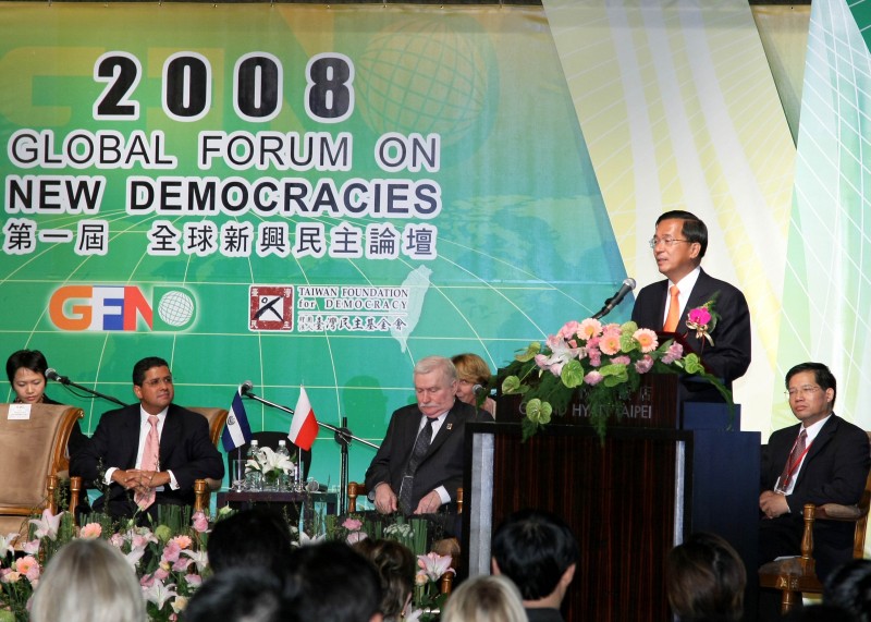 After two years of planning and preparation, the first Global Forum on New Democracies is finally taking place in Taipei. First of all, on behalf of the 23 million people and government of Taiwan, I want to extend my most sincere greetings and appreciation to participating political leaders and friends. Your involvement and support means that our shared expectations and promises can be fulfilled. We have established an ad hoc platform for exchanging views and a mechanism for cooperation, which will allow new democracies to actively promote democratic development around the world.