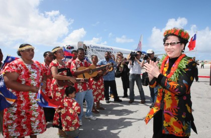 Vice President Annette Lu arrived at Majuro International Airport in the Marshall Islands at 11:05 a.m. (7:05 a.m. January 29 Taipei time) and received a warm welcome by the local public and members of the overseas compatriot community. ROC (Taiwan) Ambassador to the Marshall Islands Bruce J. D. Linghu and Marshall Islands Chief of Protocol Neijon Edwards boarded Vice President Lu's plane, while Marshall Islands Foreign Minister Tony de Brum and Majuro Mayor Riley Albarter were waiting on the tarmac to welcome the vice president. Vice President Lu and the officials at the airport to welcome her made their way to a guest room at the airport for a short visit before the vice president headed to the hotel where she is staying in Majuro. The vice president received a warm welcome and flowers upon reaching the hotel from members of the ROC (Taiwan) embassy and members of the hotel staff, led by hotel manager Bill Weza.