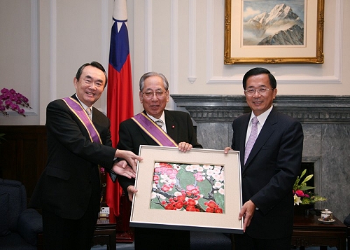 President Chen furthermore said that even though Taiwan and Japan do not maintain formal diplomatic relations, the two countries have close economic and commercial ties. He said that he is especially pleased that trade and economic cooperation between the two countries presently stands at an all time high. The president noted that bilateral trade last year exceeded US$60 billion. In addition, people of the two countries chalked up a total of 2.5 million visits to the other. These accomplishments represent the joint efforts made by the representative offices of each nation. They also highlight the efforts made by members of the Japan-ROC Diet Members' Consultative Council, for which the president expressed his appreciation. President Chen especially pointed out that when Chairman Hiranuma served as Minister of International Trade and Industry in 2001, he assisted Taiwan in becoming a formal member of the World Trade Organization. Furthermore, when he became the Chairman of the Japan-ROC Diet Members' Consultative Council in 2005, he pushed the Japanese government to provide visa-free courtesies for Taiwan tourists. In 2007, he also was instrumental in a move in which Japan and Taiwan recognized the drivers' licenses issued by each country. This has made it more convenient for young people to travel around when visiting the other's country, he said.