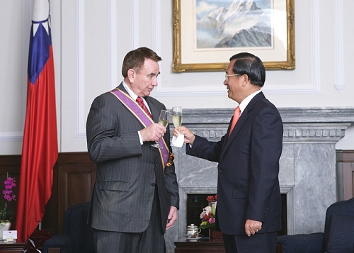 In remarks made during the proceedings, Mr. Thompson said that there is no higher honor for him than to receive an award from another nation. He recalled his first visit to Taiwan in 1978 and said that it was from that time that he fell in love with the beautiful land that makes up Taiwan and the warmth of Taiwan's people. He said observing Taiwan over the years has enabled him to have a deep understanding of the outstanding abilities of the Taiwan people and government. It is because of this that Taiwan has chalked up achievements in so many areas, he said.