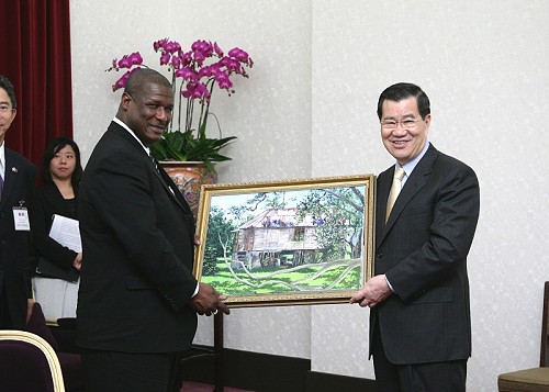 Prime Minister King, Saint Lucia Minister for Agriculture, Lands, Fisheries and Forestry Ezechiel Joseph, and Minister in the Office of the Prime Minister Charlotte Mangal were accompanied to the Presidential Building in the morning by Vice Minister of Foreign Affaires Andrew Li-Yan Hsia and ROC Ambassador to Saint Lucia Tom Chou to meet with Vice President Siew.