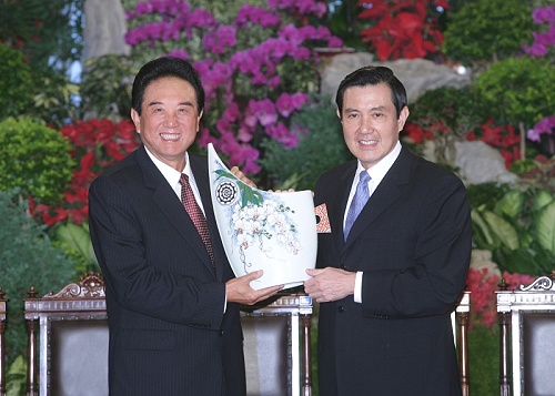 President Ma presented Chairman Chen with a ceramic replica of a Dawu tribe canoe that was made in Taiwan's ceramics center of Yingge. Painted on the canoe were Taiwan Phalaenopsis, symbolizing the three direct links between the two sides, a blossoming relationship, and bright prospects. President Ma presented Mrs. Chen with a glass art object. Meanwhile, Chairman Chen presented President Ma with a painting by the famous Mainland Chinese artist Han Meilin, renowned for his painting of horses.