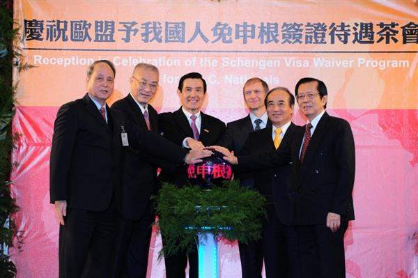 President Ma Ying-jeou on the morning of January 7 attended a reception in celebration of the ROC's inclusion in the Schengen visa waiver program. President Ma, along with Premier Wu Den-yih, Legislative Yuan President Wang Jin-pyng, Minister of Foreign Affairs Timothy Chin-tien Yang, and Head of the European Economic and Trade Office in Taipei Guy Ledoux, jointly participated in a ceremony to mark the ROC's entry into the program.