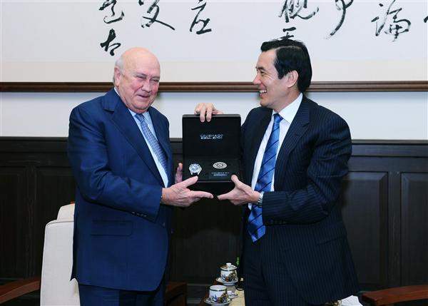 President Ma stated that former President de Klerk in 1993 jointly received the Nobel Peace Prize with another former South African president, Nelson Mandela. After retiring, former President de Klerk founded the FW de Klerk Foundation to promote ethnic peace and bring attention to tribal culture. The work carried out by the foundation has been highly praised in both South Africa and the international community. President Ma commented that the ROC in the past has experienced ethnic issues. Fortunately, increased social prosperity, democratic progress, and higher levels of education have promoted greater understanding among people, helping to take the edge off of these issues, he said. President Ma added that the ROC and South Africa share many core values. He expressed his hope that during his visit to Taiwan, former President de Klerk will engage with people here and work to promote the common values shared by the two nations.