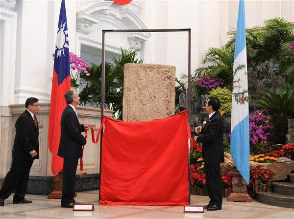 President Colom on this visit to the ROC specially presented the nation with a replica of the Mayan Dos Pilas Stela 9. Prior to the meeting, the two leaders jointly presided over a ceremony in the Entrance Hall of the Presidential Office unveiling the replica of the monument, which symbolizes the mutual friendship and resolute alliance between the two countries.