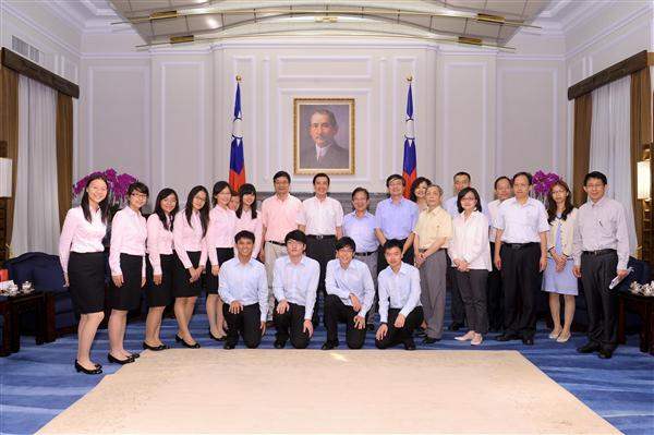 Attending the meeting were National Taiwan Science Education Center Director-general Chu Nan-Shyan (朱楠賢), Intel Taiwan Country Manager Jason L. S. Chen (陳立生), K. T. Li Foundation for the Development of Science and Technology Secretary-General Chi-Chao Wan (萬其超), GFC Foundation CEO Tang Chiu-ling (唐秋鈴), and representatives of students who had attended the science fair. The group was accompanied to the Presidential Office by Minister of Education Chiang Wei-ling (蔣偉寧) to meet President Ma. Also attending the meeting was Deputy Secretary-General to the President Hsiung Kuang-hua (熊光華).