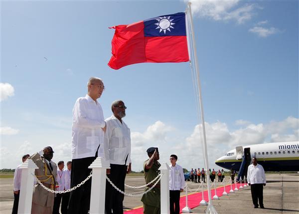 After completing their visit to the Dominican Republic, Vice President Wu and the delegation from the ROC in the afternoon flew to Belize. The chartered aircraft arrived at Philip Goldson International Airport at 2:30 p.m. on August 18 Belize time (4:30 a.m. on August 19 Taipei time). After the aircraft came to a halt, ROC Ambassador to Belize David Wu (吳建國) and Belize Chief of Protocol Diana Locke boarded the plane to welcome Vice President Wu. Belize Governor General Sir Colville Young and Minister for Foreign Affairs Wilfred Elrington were waiting by the plane to welcome the vice president. Vice President Wu received a formal military welcome and a 19-gun salute to mark his arrival, and was accompanied by Governor General Young in reviewing the Belize honor guard. The vice president also shook hands and waved to many of the overseas compatriots who were on hand to welcome him.