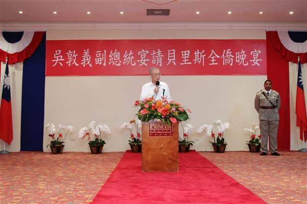 In the evening, the vice president held a banquet for overseas compatriots residing in Belize. During the event, he expressed his deepest appreciation for their longstanding support of the government. In prepared remarks, the vice president stated that during the course of his stay in Belize, overseas compatriots and locals warmly welcomed him to Belize by applauding and waving ROC flags. He said that he also has been deeply touched by seeing many ROC flags hanging on buildings alongside roads.