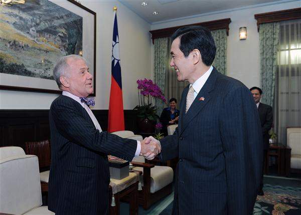 Mr. Rogers, the chairman of Rogers Holdings, along with Taishin Financial Holding Co. Chairman Thomas T.L. Wu (吳東亮), Business Today magazine publisher Hsieh Chin-ho (謝金河 ), and Taishin Investment Trust Co. Chairman Johnson C.T. Chen (陳瓊讚), visited the Presidential Office in the morning to meet with President Ma. Also attending the meeting were National Security Council Advisor Lee Chia-chin (李嘉進) and Council for Economic Planning and Development Deputy Minister Wu Ming-chi (吳明機).