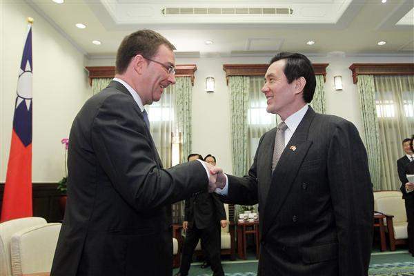 Accompanying Director Wood were Deputy Director of the British Trade and Cultural Office in Taiwan Margaret Tongue and Head of the office's Political Sector Fleur Willson. The delegation was escorted to the Presidential Office by Ministry of Foreign Affairs (MOFA) Secretary General Gary Song-Huann Lin (林松煥) and MOFA Department of European Affairs Director-General Mien-sheng Hsu (徐勉生) to meet President Ma. Also attending the meeting were Secretary-General to the President Timothy Chin-Tien Yang (楊進添) and National Security Council Advisor Francis Yi-Hua Kan (甘逸驊).