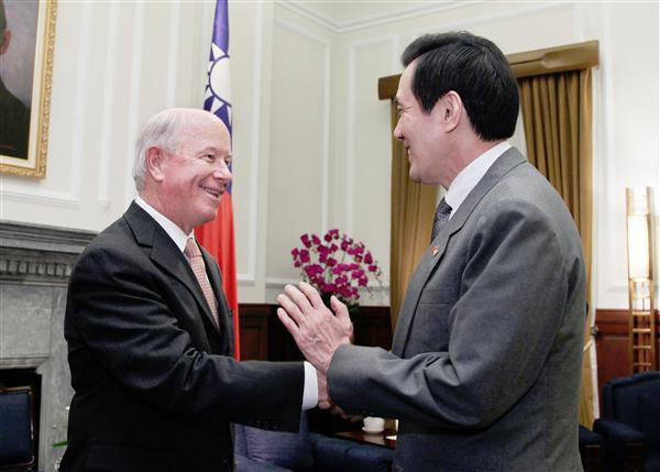 Former Assistant Secretary of State Crowley and Mrs. Crowley were accompanied to the Presidential Office by Deputy Director Brent Christensen of the Taipei Office of the American Institute in Taiwan to meet President Ma. Also attending the meeting were National Security Council Deputy Secretary-General Philip Y. M. Yang (楊永明) and Deputy Minister of Foreign Affairs Ting Joseph Shih (石定).