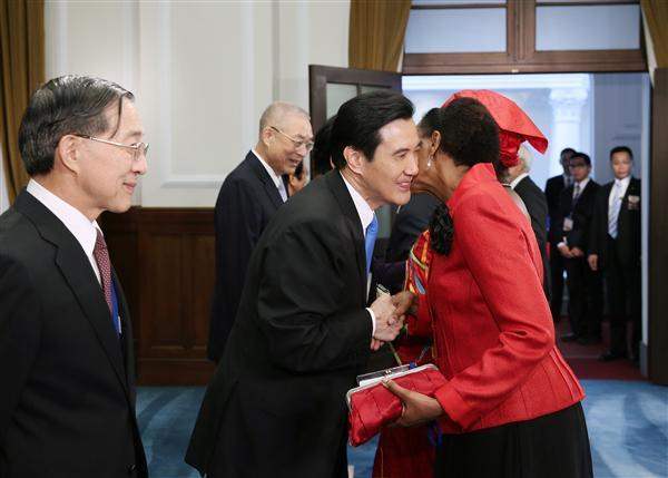 Among the roughly 250 foreign guests in attendance at the event were Palau President Tommy Remengesau Jr., Solomon Islands Prime Minister Gordon Darcy Lilo and Mrs. Lilo, The Gambia Vice President Isatou Njie-Saidy, Burkina Faso National Assembly President Soungalo Appolinaire Ouattara and Mrs. Ouattara, and Nicaraguan Minister of Foreign Affairs Samuel Santos Lopez. The activity took place at the Presidential Office at 9:30 a.m. President and Mrs. Ma and Vice President and Mrs. Wu warmly shook hands with the visitors and thanked everyone for attending the event. President Ma was also accompanied by Secretary-General to the President Timothy Chin-Tien Yang (楊進添) and Minister of Foreign Affairs David Y. L. Lin (林永樂).