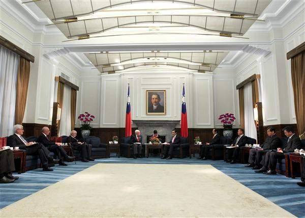 The delegation included NCAFP President George D. Schwab, NCAFP Senior Vice President and Project Director of the Forum on Asia-Pacific Security Donald S. Zagoria, Asia Society President Emeritus Nicholas Platt, Albright Stonebridge Group Senior Director Evans Joseph Robert Revere, and Pacific Forum of the Center for Strategic and International Studies President Ralph A. Cossa. The group was accompanied to the Presidential Office by American Institute in Taiwan Taipei Office Director Christopher J. Marut to meet President Ma. Also attending the meeting were Secretary-General to the President Timothy Chin-Tien Yang (楊進添), National Security Council Deputy Secretary-General Jacob Chang (張大同), and Deputy Minister of Foreign Affairs Ting Joseph Shih (石定).