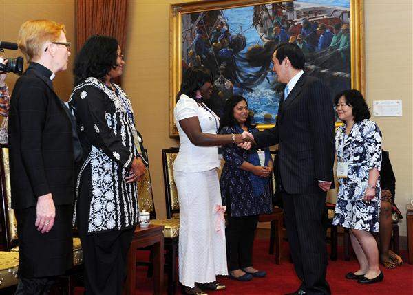 The delegation was led by World YWCA President Deborah Thomas-Austin and was accompanied to the Presidential Office by YWCA of Taiwan General Secretary Ping Lee (李萍) to meet President Ma. Also attending the meeting were National Security Council Deputy Secretary-General Jacob Chang (張大同) and the Ministry of Foreign Affairs' Department of NGO International Affairs Director General Wu Rong-chuan (吳榮泉).
