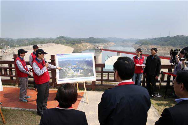 After arriving, the president went to the viewing platform to examine the current water levels at the reservoir. He then made his way to the reservoir's management center where he received a briefing from the Ministry of Economic Affairs' (MOEA) Water Resources Agency (WRA), following which he engaged in a discussion with representatives from companies in the Hsinchu Science Park, local government leaders, and the MOEA on measures to combat the drought.