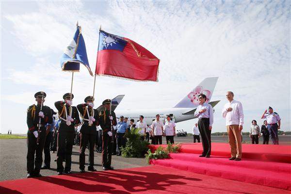 After the president's chartered aircraft came to a halt, the ROC Ambassador to Nicaragua Rolando Jer-ming Chuang (莊哲銘) and Nicaragua's Presidential Protocol Officer Roberto Quant boarded the plane to welcome him. Nicaraguan Presidential Delegate for Investment Alvaro Baltodano was waiting on the tarmac next to the plane, and then escorted President Ma down a red carpet where he was greeted with military honors. Among those on hand to extend a cordial welcome to the ROC delegation were Nicaraguan President Daniel Ortega Saavedra's eldest son Rafael Ortega, Minister of Development, Industry and Trade Rolando Solorzano, and Minister of the Environment and Natural Resources Juana Argenal.