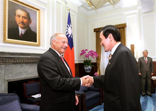 President Ma Ying-jeou met on the afternoon of September 3 with United States Congressman Steve King. In addition to extending a cordial welcome to Congressman King on his visit to the ROC to attend events commemorating the 70th anniversary of the ROC's victory in the War of Resistance Against Japan, the president also explained to the congressman the efforts and achievements of the ROC government in promoting relations between the two countries and instituting a volunteer military system.
