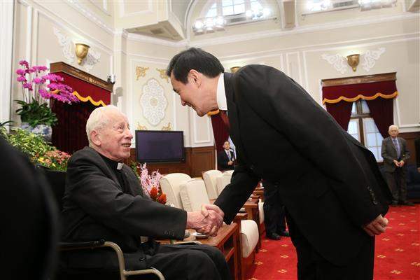 President Ma then turned to Father Georges Etienne Beauregard, 102 years old this year, who established a hospital and a childcare center in the Nan'ao area of Yilan County, counseled dropouts to encourage them to return to school, and helped youth find employment. Father Brendan Michael O'Connell, meanwhile, founded St. Theresa Opportunity Center and the Bethlehem Foundation to help the developmentally disabled cultivate a stronger sense of self-worth. His many years of unflagging efforts are greatly appreciated, said the president. Also among the honorees was Father Andres Diaz de Rabago, who taught medical ethics at National Taiwan University for over 30 years. His past students now work throughout Taiwan as doctors, nurses, and pharmacologists, and President Ma stated that Father Andres deserves the greatest respect for his tremendous dedication to ethics in medicine.