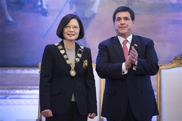 President Tsai noted that the medal of honor presented to her by President Cartes was named after Marshal Francisco Solano Lopez, who put his life on the line in fighting for Paraguay, so the medal represents the highest honor. Its conferral upon her also shows the great importance that Paraguay attaches to its friendship with Taiwan, the president added, and she felt deeply honored.