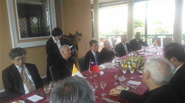 After finishing the embassy tour, Vice President Chen—accompanied by National Security Council Deputy Secretary-General Tseng Hou-jen (曾厚仁), Deputy Foreign Minister Wu Chih-chung (吳志中), and Ambassador Lee—proceeded to Domus Internationalis Paulus VI hotel, where he attended a luncheon along with many senior members of the clergy, including: Giuseppe Cardinal Versaldi, Prefect of the Congregation for Catholic Education; Oscar Andrés Cardinal Rodríguez Maradiaga, former president of Caritas Internationalis and current coordinator of the Council of Cardinals; Giovanni Battista Cardinal RE, Prefect Emeritus of the Congregation for Bishops; Archbishop Piero Marini, president of the Pontifical Committee for International Eucharistic Congresses; and Jean-Marie Musivi Mpendawatu, Undersecretary of the Pontifical Council for Health Care Ministry.