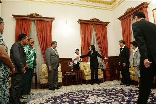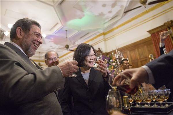 Among those present at the event were: Prime Minister of St. Vincent and the Grenadines Ralph E. Gonsalves and Mrs. Gonsalves; Speaker of the Marshall Islands Nitijela (Parliament) Kenneth A. Kedi and Mrs. Kedi; President Jose Antonio Alvarado of the Central American Parliament; Burkina Faso Minister of Foreign Affairs and Regional Cooperation Alpha Barry; and US Congressman and Chair Emeritus of the House Committee on Energy & Commerce Joe Barton. President Tsai and Vice President Chen and Mrs. Chen chatted amiably with the guests from around the world. The president was also accompanied by Premier Lin Chuan (林全) as well as Minister of Foreign Affairs David T. Lee (李大維) and Mrs. Lee.