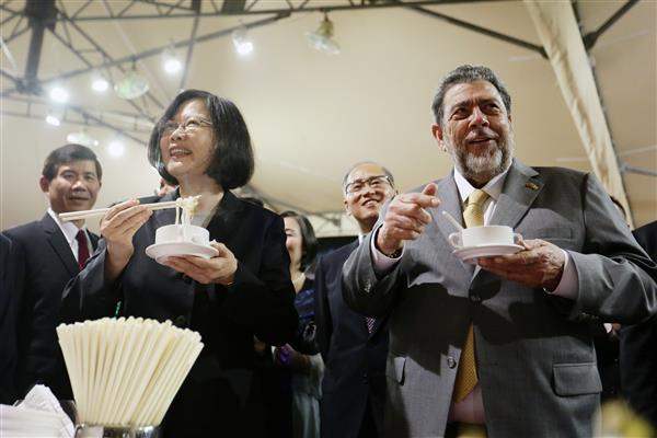 President Tsai then accompanied Prime Minister Gonsalves and Mrs. Gonsalves to see booths displaying well-known Taiwanese treats such as King Car Whisky, Hakka foods, dishes from the Din Tai Fung restaurant chain, spirits from the Matsu Liquor Factory, and dough figurines. The president described these items for her guests and joined them in taste testing the whisky, Hakka flat noodles, steamed dumplings, and kaoliang liquor. Because the president raises cats at home and Prime Minister Gonsalves was born in the Year of the Dog, the artisan at the dough figurine stall crafted some cat and dog figurines for the president and the prime minister.