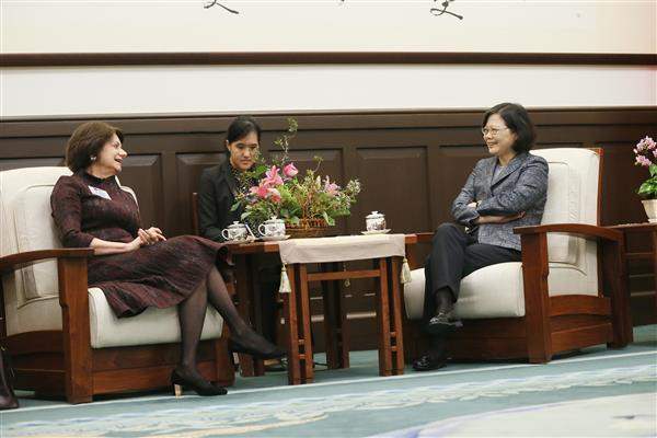 In remarks, President Tsai noted that delegation head and NCAFP President Rosemary DiCarlo is an outstanding career diplomat who is deeply knowledgeable about European and Eurasian affairs as well as the work of the United Nations. President Tsai warmly welcomed Ms. DiCarlo on her first visit to Taiwan as the head of a delegation, and said she looked forward to hearing Ms. DiCarlo's views on current international affairs. Noting that the other delegation members are all long-time friends of Taiwan with a sophisticated understanding of political and economic conditions here as well as the current state of cross-strait relations, the president said she hoped to engage in a full exchange of views with everyone.
