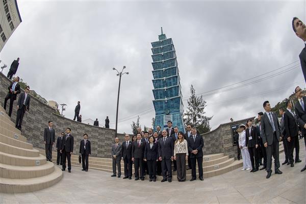 After the conclusion of their visit to the Basilica of Suyapa, President Tsai and her delegation went to see the Plaza Republica de China (Taiwan). Tegucigalpa Mayor Nasry Juan Asfura Zablah had the plaza built along one of the city's main thoroughfares to thank Taiwan for its years of support for Honduran development, and to underscore the friendship between the two countries. Mayor Asfura greeted the president at the entrance to the plaza and presented her with a key to the city as a gesture of welcome to the delegation. President Tsai and the delegation members posed for a group photo before a scale model of the Taipei 101 skyscraper.