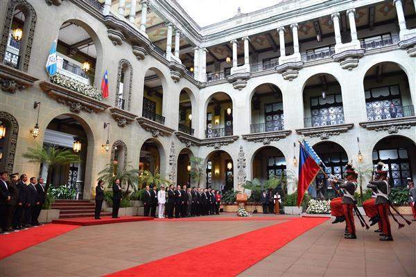 President Tsai and her delegation then proceeded to the National Palace of Culture, where Guatemalan President Jimmy Morales, Vice President Jafeth Cabrera, and Foreign Minister Morales welcomed them with military honors. After the playing of each country's national anthem, the two heads of state each delivered an address and introduced their respective cabinet members and the members of the visiting delegation.