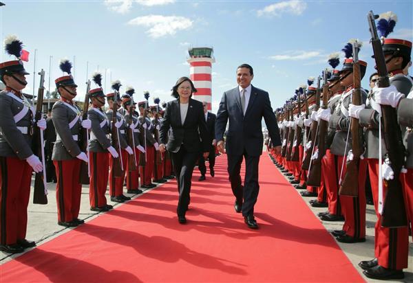 After President Tsai's chartered aircraft came to a halt on the tarmac, ROC Ambassador to Guatemala Lai Chien-chung (賴建中) and the Guatemalan chief protocol officer boarded the plane to welcome the president. Guatemalan Minister of Foreign Affairs Carlos Raul Morales welcomed President Tsai at the foot of the airstair, and then accompanied her in accepting a red-carpet military honor guard salute.