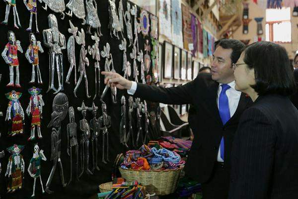 After hosting a state banquet for President Tsai at the National Palace of Culture, President Morales accompanied her to Antigua to tour the old town and take a commemorative photo at the Santa Catalina Arch, a local landmark. President Tsai used a 360-degree camera to shoot a video with President Morales, who served as her guide as she toured shops where all sorts of distinctive local indigenous handicrafts were sold.