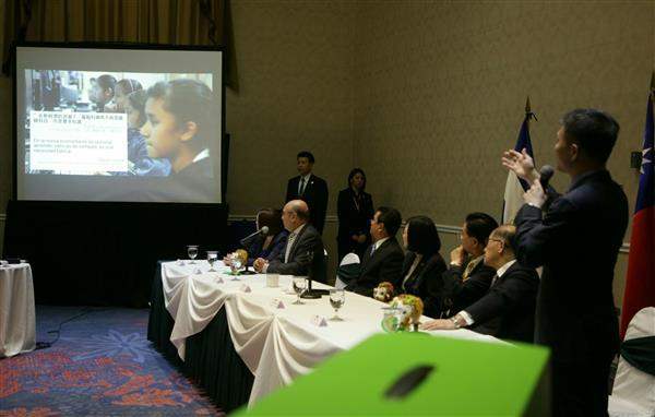 Following the conclusion of the president's remarks, Robert Wang briefed listeners on the project to promote the teaching module for CloudProfessor. Salvadoran Education Minister Carlos Canjura then outlined his country's technology education program, and thanked Taiwan for helping El Salvador move toward joining the international mainstream. With President Tsai looking on as a witness, ROC Ambassador to El Salvador Florencia Miao-hung Hsie (謝妙宏) donated the teaching module for CloudProfessor to Education Minister Canjura.