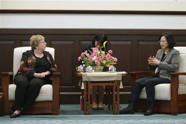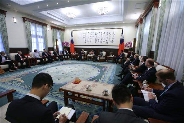 During the meeting, the visitors engaged in a wide-ranging exchange of views with the president on such topics as cross-strait relations, the New Southbound Policy, mainland China's Belt and Road Initiative, and the development of high-tech industries and energy resources.