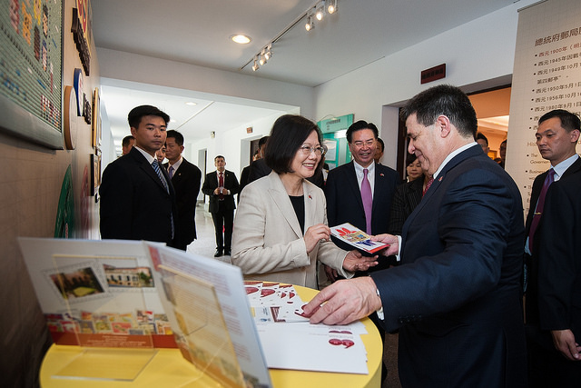 Next, President Tsai and President Cartes proceeded to the Presidential Office Building Post Office and attended a ceremony for the issuance of commemorative stamps marking the 60th anniversary of diplomatic relations between the Republic of China and the Republic of Paraguay.