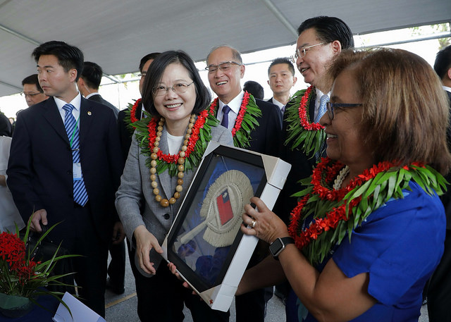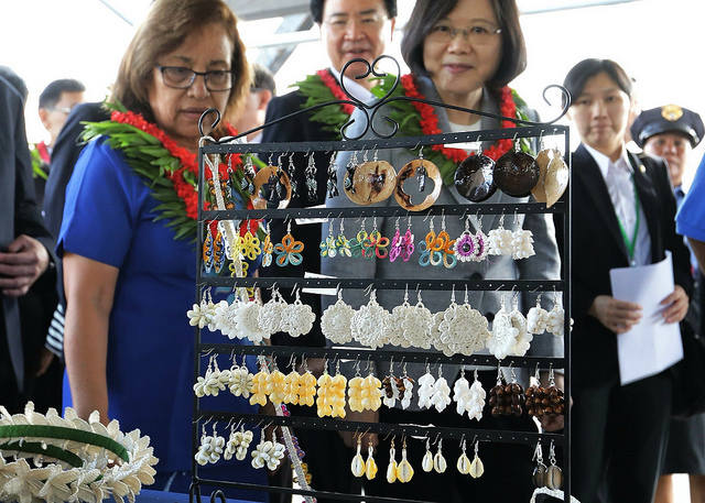 At about 11:00 a.m. on October 31 local time (7:00 a.m. on October 31, Taipei time), President Tsai Ing-wen and her delegation attended a "One Island One Product" handicrafts exhibit together with Marshall Islands President Hilda C. Heine at the College of the Marshall Islands. It was an excellent opportunity to learn about the special handicrafts produced on each of the Marshallese atolls and islands.