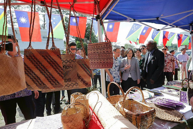 After President Tsai arrived at the site of the future handicrafts center, Solomon Islands Minister of Culture and Tourism Bartholomew Parapolo and Permanent Secretary of the Ministry of Culture and Tourism Andrew Nihopara accompanied her to see various handicrafts booths. The setting was decidedly upbeat and relaxed as the president picked out a few hand-woven fans and handbags