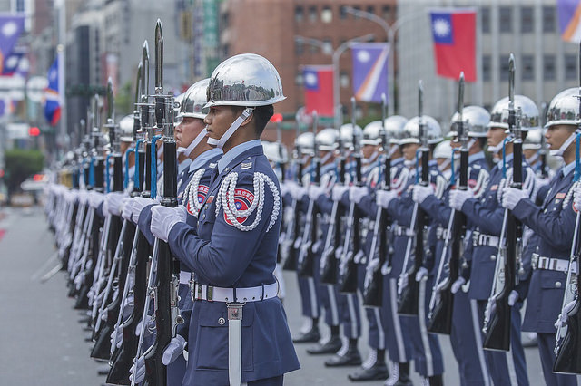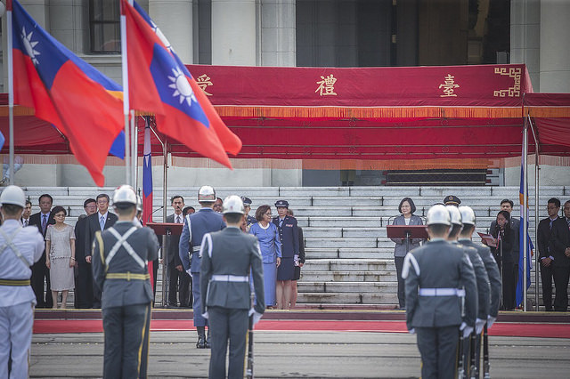 The military honors ceremony got underway at 4 p.m. in the plaza fronting the Presidential Office Building. Following a 21-gun salute, playing of the two countries' national anthems, and a military review, President Tsai and President Heine each delivered remarks.