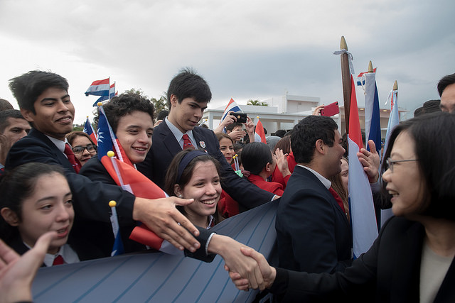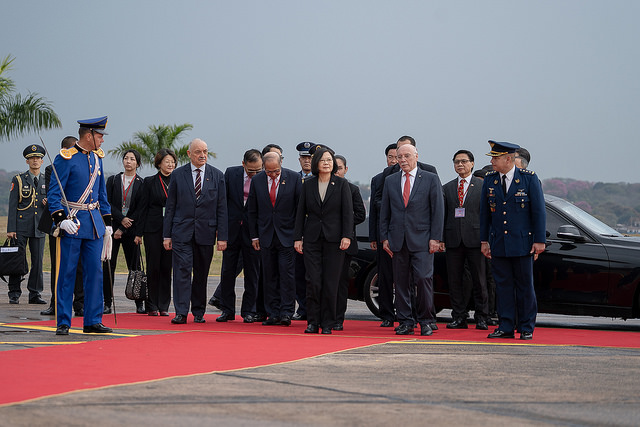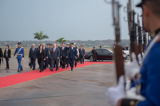 After the delegation's chartered plane came to a halt, Taiwan's ambassador to Paraguay Diego L. Chou (周麟) and Paraguayan Director General of Protocol Ercilia Giménez boarded the plane to welcome the president. After the president disembarked, and accompanied by National Security Council Secretary-General David T. Lee (李大維) and Foreign Minister Joseph Wu (吳釗燮), the president travelled by limousine to a red-carpet area fronting the state protocol lounge for a welcome ceremony. She was welcomed by Paraguayan Minister of Foreign Affairs Eladio Loizaga.
