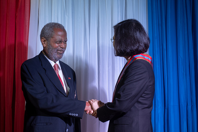 After President Tsai arrived, Governor-General Young accompanied her to view artifacts on display at the Museum of Belize. The president was then awarded a sash and the Order of Belize, presented by Governor-General Young, to recognize her outstanding leadership, and her support for and friendship toward Belize.