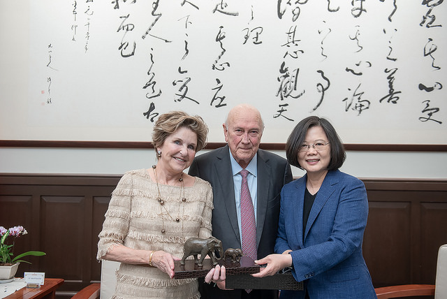 President Tsai remarked that she very much agrees with Mr. de Klerk's view, and that Taiwan will uphold its values, work together with like-minded countries, and shoulder its responsibilities as a member of the international community. She hopes for more exchanges and cooperation with South Africa's public and private sectors, as well as the FW de Klerk Foundation. In closing, the president once again welcomed Mr. and Mrs. de Klerk to Taiwan, and expressed hope that Taiwan and South Africa will continue to shine on the global stage because of the harmony and co-prosperity of their diverse ethnic groups and cultures.