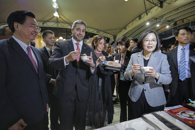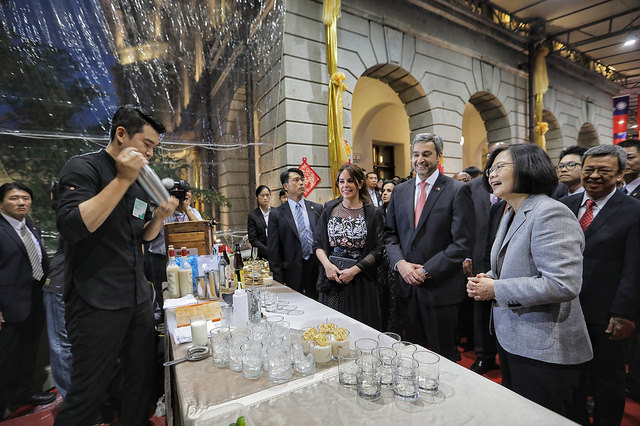 The reception featured traditional cuisine from all parts of Taiwan, as well as Asian, Western, and vegetarian dishes. President Tsai first gathered with President Abdo, Mrs. Abdo, and other distinguished guests in the east wing of the Taipei Guest House to tell them about the building's architecture and history. Shortly thereafter, President Tsai, President and Mrs. Abdo, and other guests enjoyed a creative cocktail made with almond tea and sachima pastry. They also tried out a number of Taiwanese delicacies, including steamed dumplings, shrimp dumplings, mini bean-paste buns, meatballs (a well-known Tainan specialty), and old-fashioned peanut ice cream.