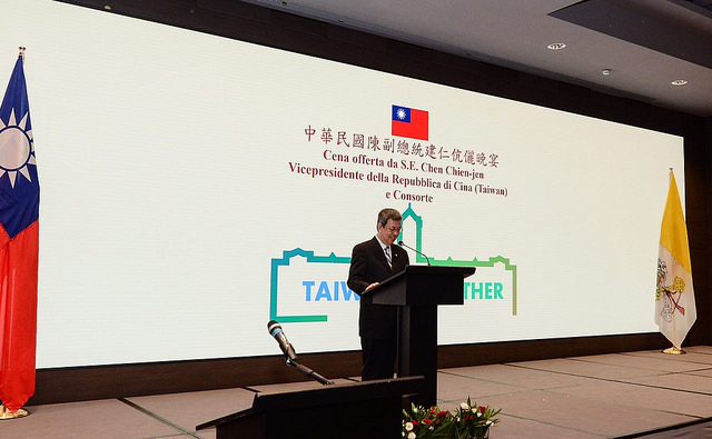 After ROC Ambassador to the Holy See Matthew S.M. Lee (李世明) delivered the opening remarks and Vice President Chen took group photos with the guests, Bishop Thomas An-zu Chung (鍾安住) of the Diocese of Chiayi led the assembled guests in a pre-banquet prayer. During the banquet, the wife and two daughters of Dr. Paul Tien (田春生) from Tainan performed works arranged for piano, soprano and flute including White Peonies (a popular Taiwanese folk song), Mattinata (a well-known Italian song), and the much-loved Salut d'Amour.