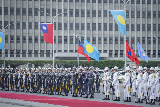 The welcome ceremony with full military honors was held at 4:00 pm (Taipei time) in the square fronting the Presidential Office Building. After a 21-gun salute and the playing of the two countries' national anthems, President Tsai and President Remengesau reviewed the military honor guard and delivered remarks.