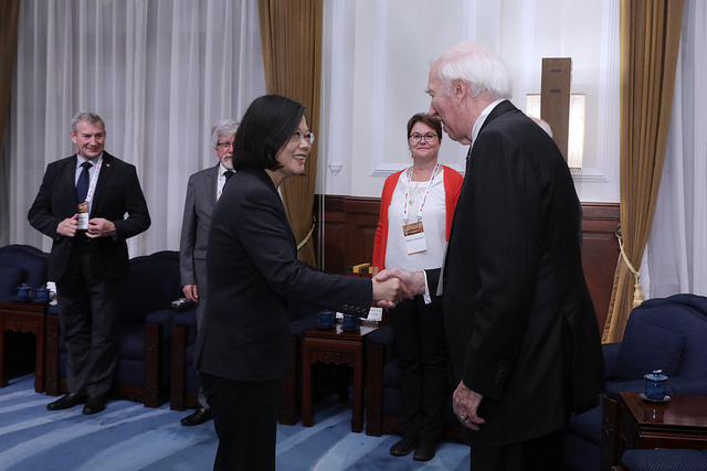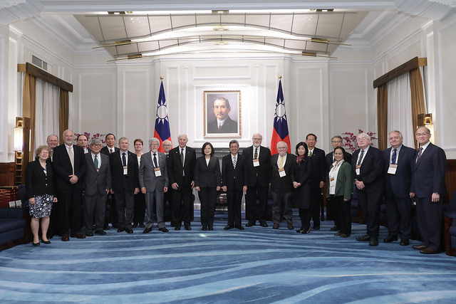 President Tsai began her remarks by welcoming her visitors to the Presidential Office. She then thanked the delegation members for coming all the way to Taiwan for the International Scientific Leaders' Forum, held in conjunction with Academia Sinica's 90th Anniversary Celebration, and sharing the latest academic developments in their respective countries.