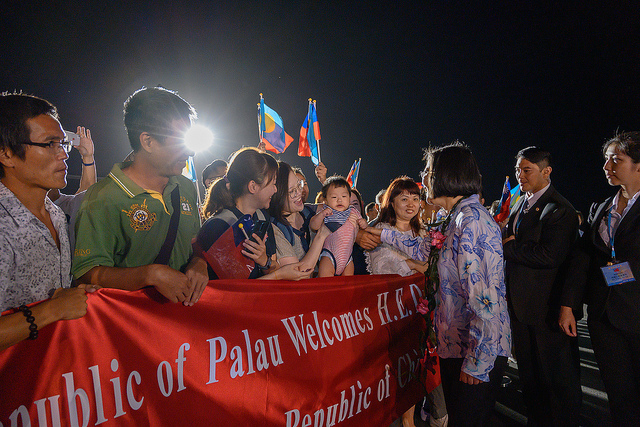 After the aircraft came to a halt on the tarmac, ROC Ambassador to Palau Wallace M.G. Chow (周民淦) and Palau Minister of State Faustina Rehuher-Marugg boarded the plane to welcome her. A young Palauan opened the ensuing welcome ceremony by blowing on a conch shell in an expression of welcome. President Tsai waved to the welcoming crowd as Taiwan's Foreign Minister Joseph Wu (吳釗燮) accompanied her off the aircraft to the bottom of the airstair, where Palau Vice President Raynold Oilouch was waiting to greet her and shake hands. President Tsai then accepted a welcoming wreath from a young Palauan student.