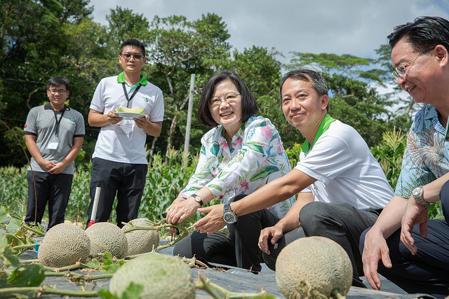 President Tsai then asked Taiwan Technical Mission in Palau Chief Pang-chi Yang (楊邦棋) to introduce each of the mission members individually, and each member shared their experiences and thoughts on working in Palau. The president then took a walking tour of the fruit and vegetable garden, where she heard reports in an area cultivating dragonfruit, as well as areas growing guava, calamondin oranges, and wax apples from Taiwan, and she personally picked and tasted a cantaloupe.
