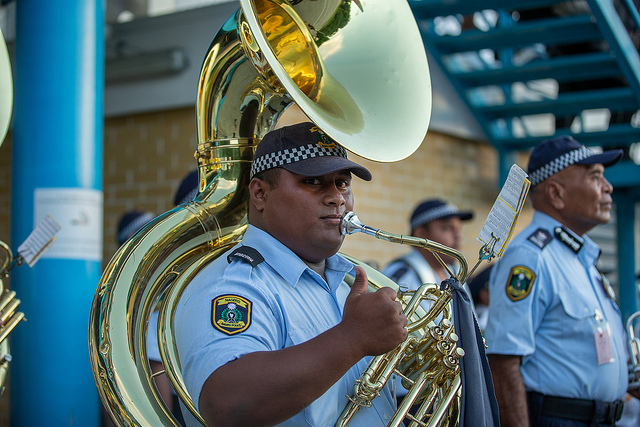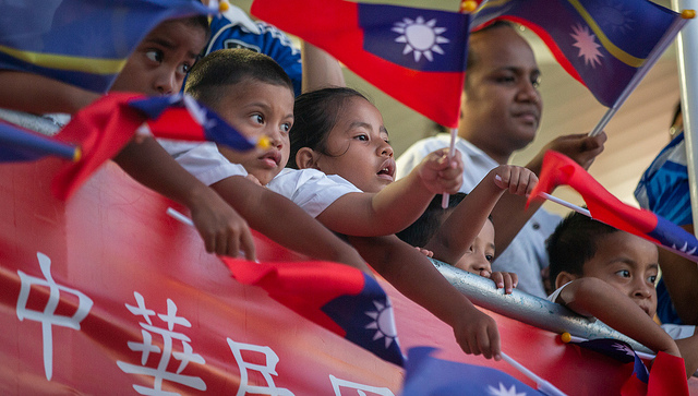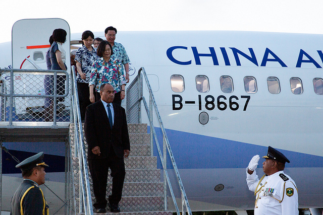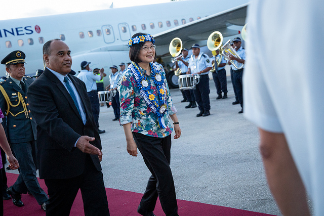 After President Tsai's aircraft came to a halt on the tarmac, ROC (Taiwan) Ambassador to Nauru Chow Chin-fa (周進發) and Nauru Secretary for Foreign Affairs and Trade Michael Aroi boarded the plane to welcome her. President Tsai waved to the welcoming crowd as ROC (Taiwan) Minister of Foreign Affairs Joseph Wu (吳釗燮) accompanied her off the aircraft to the bottom of the airstair, where she was greeted by Nauru Minister for Health, Education, Home Affairs, and Land Management Charmaine Scotty. President Tsai then accepted a welcoming wreath from a Nauruan woman and strolled past a female police honor guard while a Nauru police band performed a welcome hymn amidst a lively and festive atmosphere.