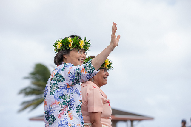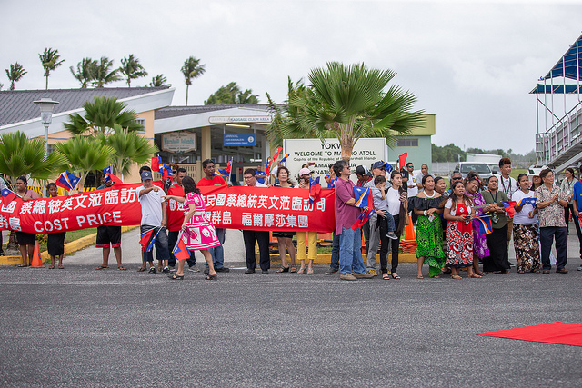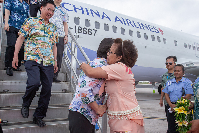 After the aircraft came to a halt on the tarmac, ROC (Taiwan) Ambassador to the Marshall Islands Jeffrey S.C. Hsiao (蕭勝中) and Marshall Islands Ambassador to the ROC (Taiwan) Neijon Edwards boarded the plane to welcome President Tsai. She waved to the welcoming crowd as Taiwan's Foreign Minister Joseph Wu (吳釗燮) accompanied her off the aircraft to the bottom of the airstair, where Marshall Islands President Hilda Heine and her husband waited to greet her and shake hands. President Tsai also accepted a floral garland from Majuro Chief Ester Zedkaia before making her way down the red carpet with President Heine to wave greetings to the young Marshallese and Taiwanese expatriates in attendance amidst a lively and jubilant atmosphere.