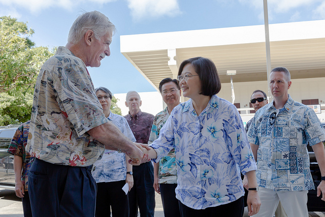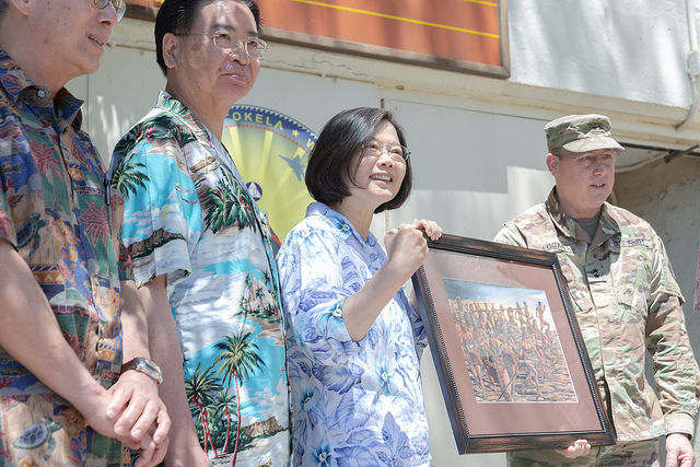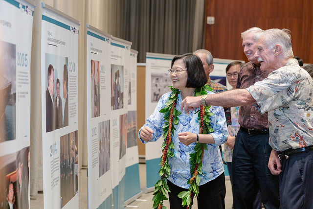 After arriving at the East-West Center, President Tsai was accompanied by American Institute in Taiwan (AIT) Chairman James Moriarty, EWC Chairman Richard Turbin, and Taiwan's Representative to the United States Stanley Kao (高碩泰) on a tour of the exhibition titled TRA@40, which was jointly organized by the Taipei Economic and Cultural Representative Office in the United States and AIT. The 40 images on display at the exhibition show how Taiwan-US friendship has evolved and strengthened over the past 40 years.
