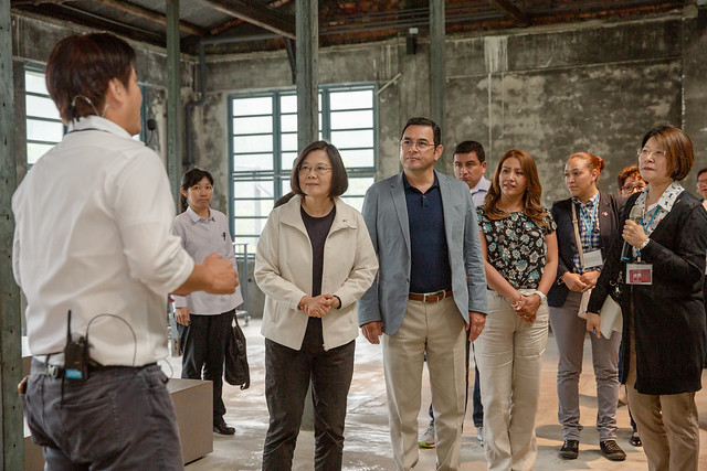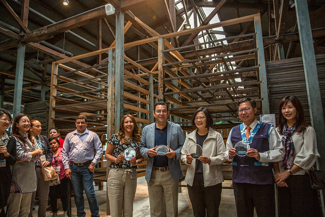 The group, accompanied by Minister of Foreign Affairs Joseph Wu (吳釗燮) and Taoyuan City Mayor Cheng Wen-Tsan (鄭文燦) and his wife, watched a film and learned about the history of the Daxi Tea Factory. They also saw historical artifacts such as tea rollers and other tea manufacturing equipment, and tasted teas together, gaining a personal appreciation of Taiwan's unique tea culture.